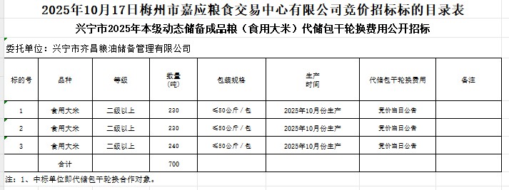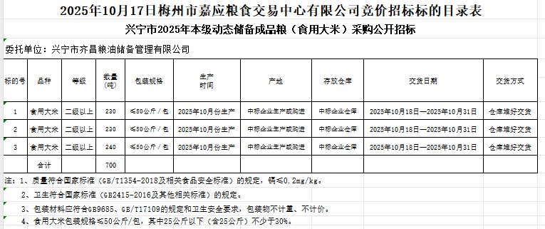 興寧市2025年本級(jí)動(dòng)態(tài)儲(chǔ)備成品糧(食用大米)采購(gòu)及代儲(chǔ)包干輪換費(fèi)用公開(kāi)招標(biāo)公告