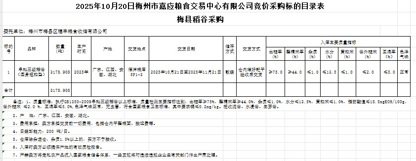 受客戶委托,梅州市嘉應(yīng)糧食交易中心有限公司定于2025年10月20日(星期一)舉辦糧食競價交易會。梅州市梅縣區(qū)穗豐糧食收儲有限公司擬采購2025年產(chǎn)早秈稻谷3178.908噸。