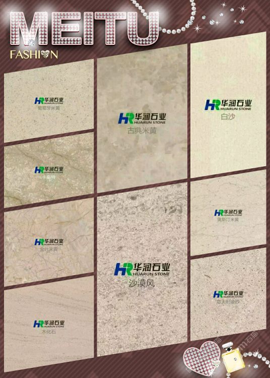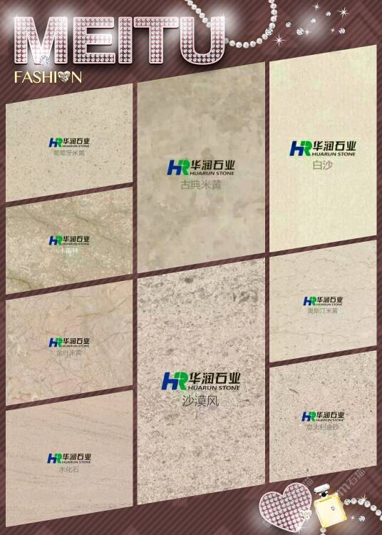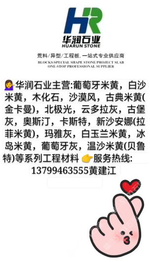 華潤(rùn)石業(yè)主營(yíng):葡萄牙米黃,白沙米黃,木化石,沙漠風(fēng),古典米黃,北極光,云多拉灰,奧斯汀米黃,卡斯特米黃,貝魯特等工程系列石材。