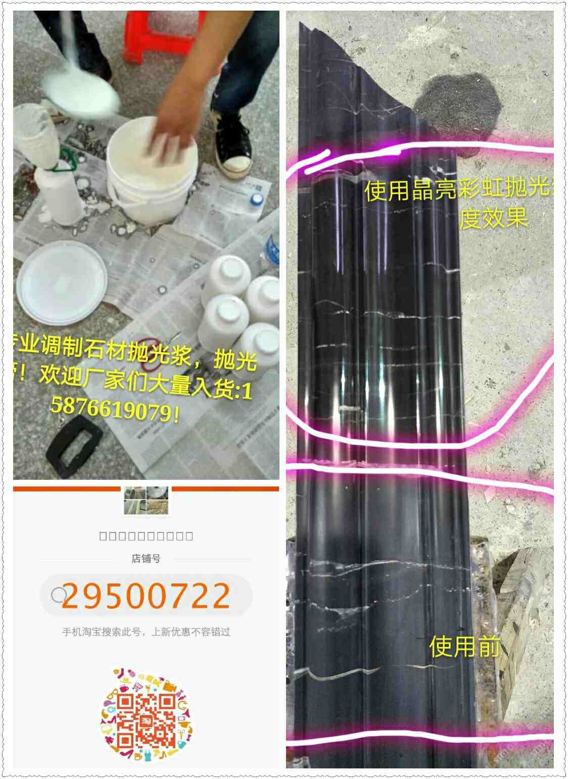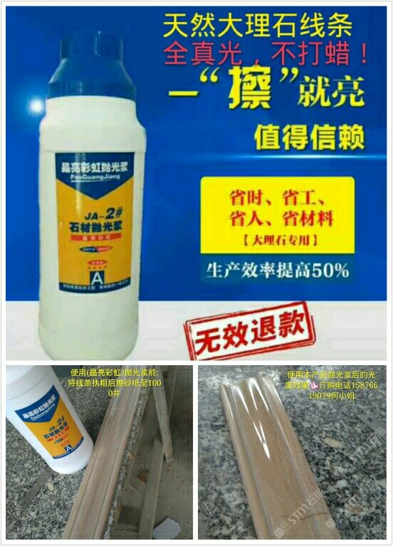 (晶亮彩虹拋光漿)為配方調制。從2016年5月份開始靠著技術員親自逐間上門到云浮多家石材工藝廠施展產(chǎn)品使用技術和試驗產(chǎn)品光度效果取得了各家老板和工藝師們的稱贊和認可,通過短短一年的時間品牌:晶亮彩虹拋光漿全國省地已約2000家石材廠正在使用,市場反應效果顯注,現(xiàn)面向全國誠招代理商??头峋€:15876619079
