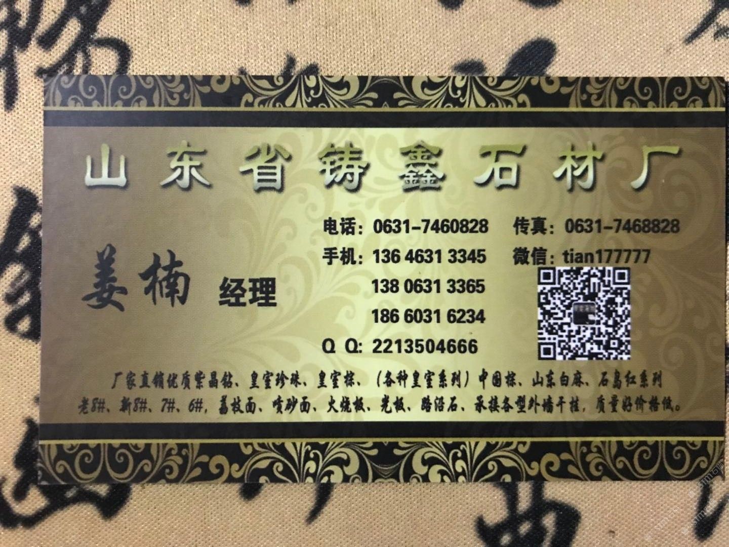 中國山東威海您好我是山東省榮成市石島紅產(chǎn)地鑄鑫石材有限公司公司成立于1992年主要經(jīng)營:石島紅老8#新8#7#6#皇室系列紫晶鉆白麻榮成灰等優(yōu)質(zhì)產(chǎn)品,A級荒料火燒板光板荔枝面復(fù)古