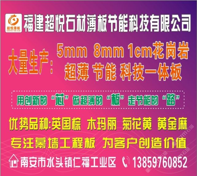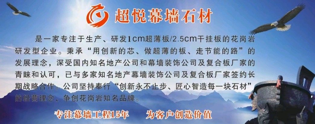 是一家專注于生產(chǎn)、研發(fā)1CM超薄板/2.5CM干掛板的花崗巖研發(fā)型企業(yè)。秉承“用創(chuàng)新的芯、做超薄的板、走節(jié)能的路”的發(fā)展理念,深受國(guó)內(nèi)知名地產(chǎn)公司和幕墻裝飾公司的青睞和認(rèn)可,已與多家知名地產(chǎn)幕墻裝飾公司簽約長(zhǎng)期戰(zhàn)略合作。\\