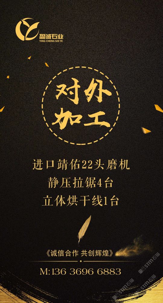 加工廠(chǎng)內(nèi)設(shè)進(jìn)口靖佑22頭磨機(jī),靜壓拉鋸4臺(tái),立體烘干線(xiàn)1臺(tái)。5臺(tái)快鋸、16頭自動(dòng)磨、3臺(tái)中切機(jī)、雙層補(bǔ)板線(xiàn)及烘干線(xiàn)、紅外線(xiàn)橋切、倒角磨邊機(jī)械、大型工程深加工,集設(shè)計(jì)、銷(xiāo)售,加工一體化流水式作業(yè)。承接外墻干掛、園林鋪地、異形加工、條板批發(fā)及出口訂單。本公司一直堅(jiān)持從礦山源頭把關(guān),為客戶(hù)爭(zhēng)取更大的品質(zhì)與優(yōu)勢(shì)