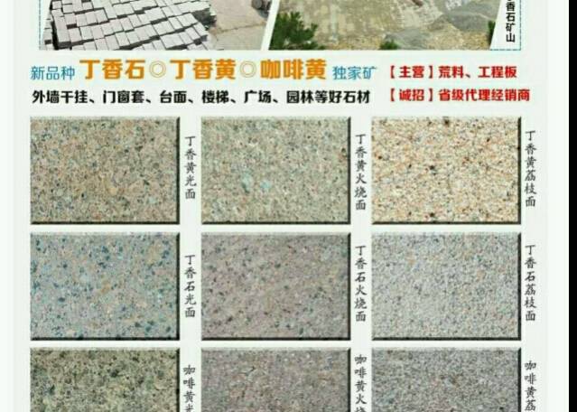 發(fā)布信息: [微笑]礦、廠、銷一體企業(yè)[微笑] [強(qiáng)]自有.獨(dú)特.新品---丁香石、丁香黃、咖啡黃[強(qiáng)] 珍珠蘭 外墻干掛、門窗套、臺(tái)面、樓梯、廣場(chǎng)、園林等好石材 【主營(yíng)】荒料、板材、工程板 誠(chéng)招:省、市級(jí)代理經(jīng)銷商 財(cái)富熱線:15860870557楊