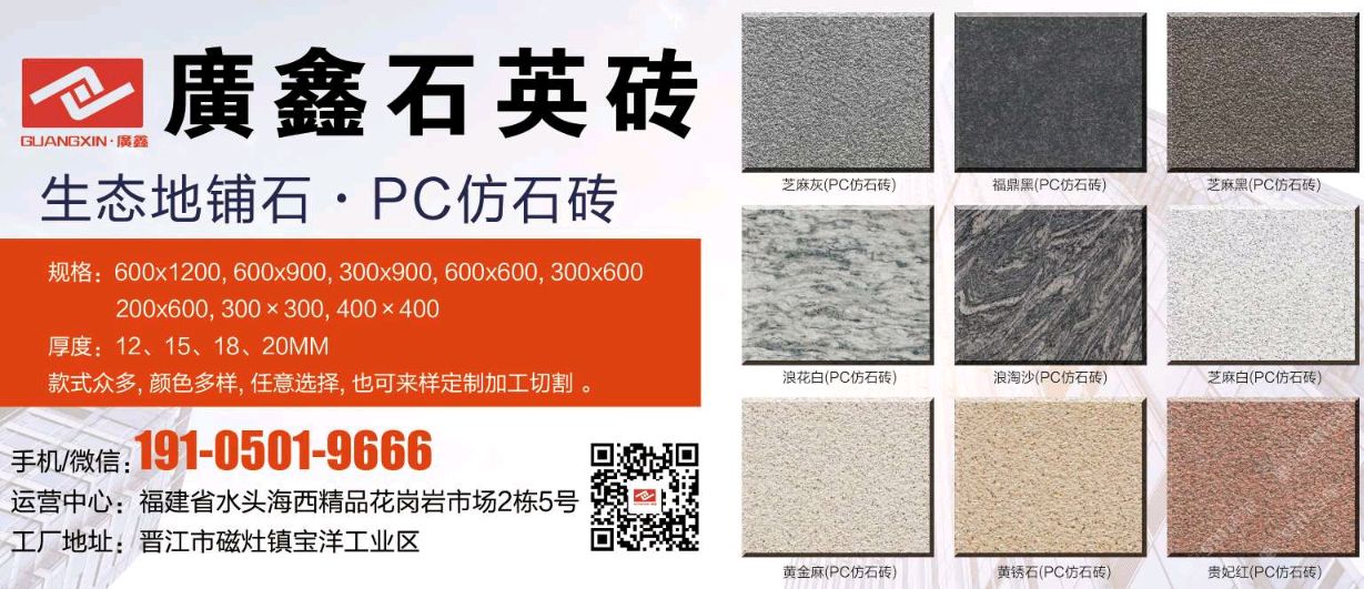 廣鑫石英磚/PC磚 聯(lián)系人:劉    134****2000 查看 手機(jī)號(hào)碼:無 主營范圍: 花崗巖加工、石材外貿(mào)、更多、環(huán)境石材、大理石加工、 企業(yè)地址:福建泉州福建省泉州市南安市水頭鎮(zhèn)海西石材城海五路1-81\\n