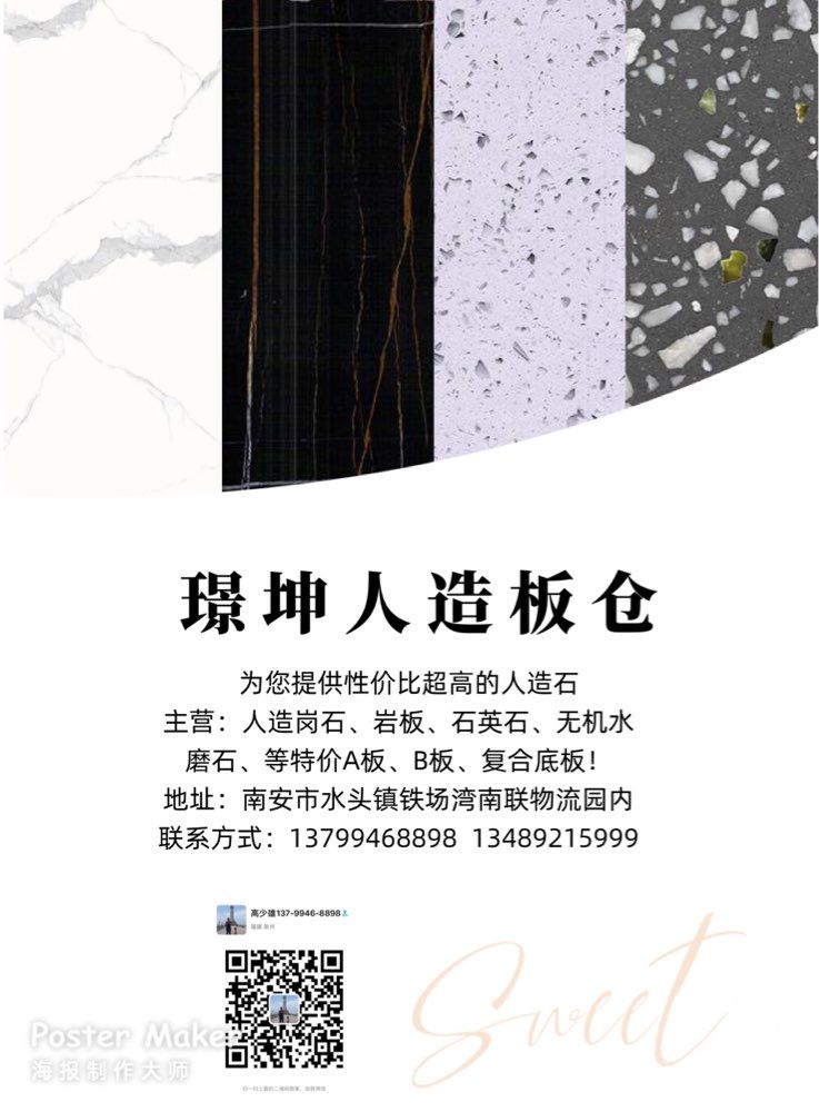 ~璟坤人造板倉(cāng)~特價(jià)人造石 主營(yíng):人造崗石、石英石、巖板、無(wú)機(jī)水磨石 現(xiàn)推出特價(jià)優(yōu)惠的人造板 特價(jià)A板、B板、復(fù)合底板專用 聯(lián)系電話:13799468898高先生 地址:南安市水頭鎮(zhèn)鐵場(chǎng)灣南聯(lián)停車場(chǎng)內(nèi)(華置石業(yè)斜對(duì)面)#璟坤人造板倉(cāng)##璟坤石業(yè)專注:別墅,會(huì)所,酒店等室內(nèi)外精裝石材#