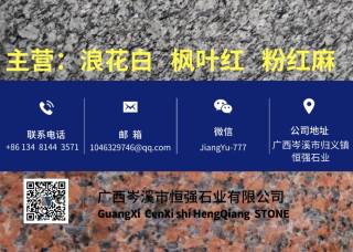 廣西岑溪市恒強石業(yè)主營產(chǎn)品:海浪花(浪花白),浪花白1,浪花白(海浪花),浪花白,楓葉紅(荔枝面),楓葉紅(菠蘿面),楓葉紅(斧剁面),楓葉紅(火燒面),楓葉紅,粉紅麻2企業(yè)地址:廣西岑溪歸義鎮(zhèn)恒強石業(yè)