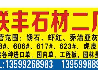 聯(lián)豐石材二廠主營(yíng)產(chǎn)品:G681,銹石,G606(副礦),漳浦紅G648,漳浦蝦紅,黃銹石,古典灰麻,港尾銹石(荔枝面),港尾銹石(光面),漳浦銹(荔枝面),漳浦銹(火燒面),黃金鉆1,芝麻白G623,白麻企業(yè)地址:福建南安石井鎮(zhèn)聯(lián)豐埭頭高速橋旁。
